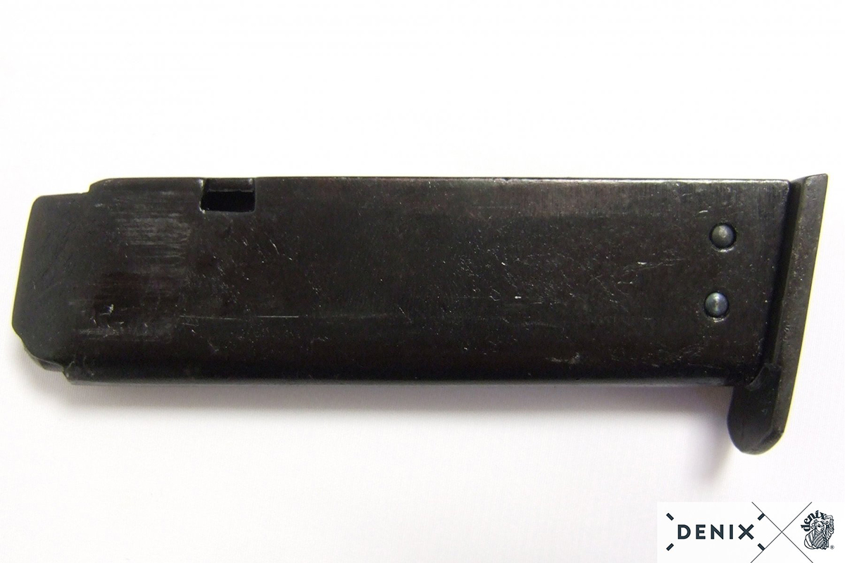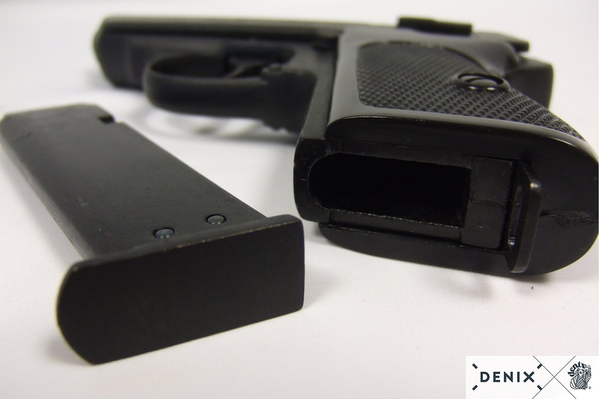 Réplique Denix Walther PPK finition noire avec chargeur amovible. Pistolet compact emblématique, idéal pour cinéma, collection et reconstitution historique.