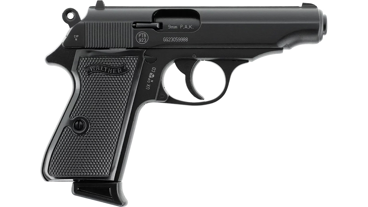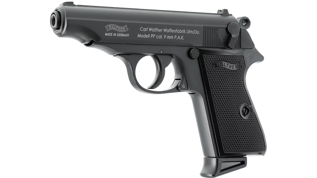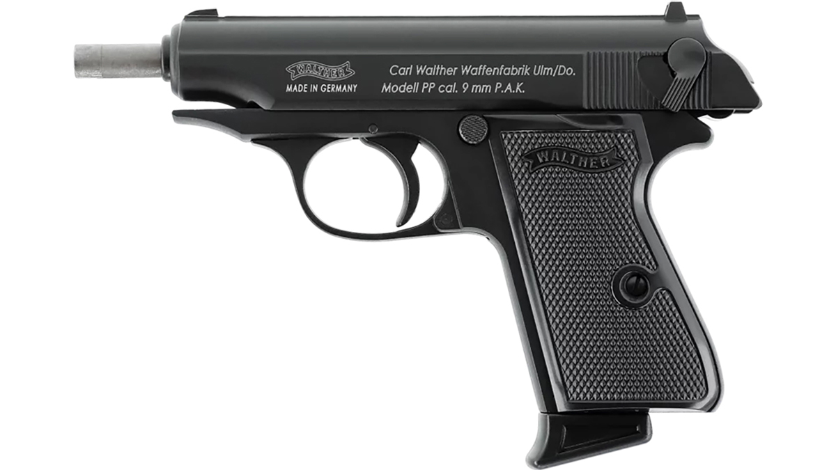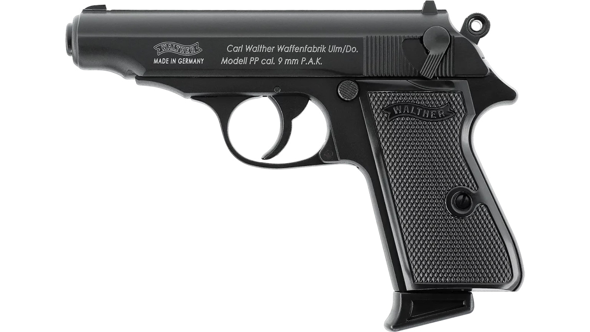 Pistolet à blanc Walther PP Umarex noir en calibre 9 mm P.A.K., semi-automatique avec chargeur 7 coups, mallette incluse. Catégorie C12°