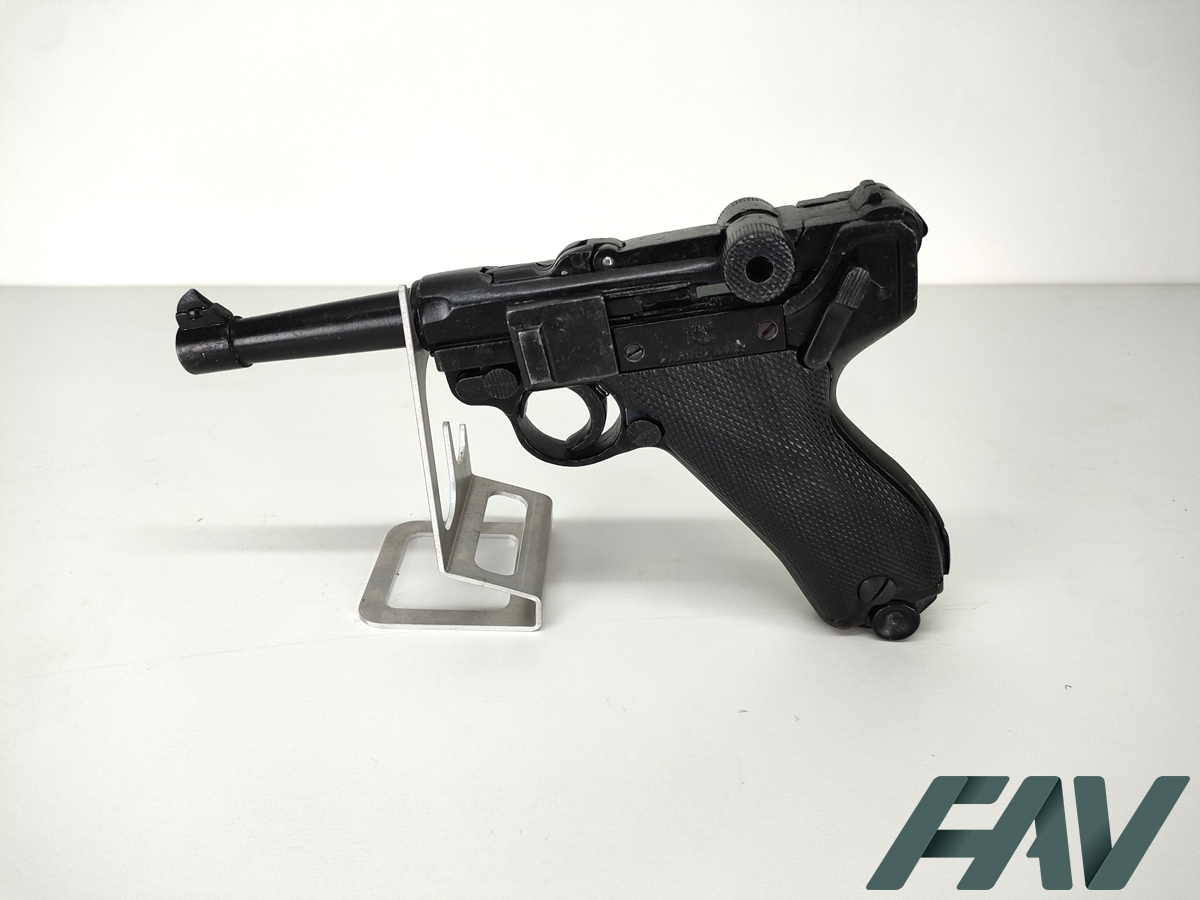 Le pistolet dispose d’une culasse mobile et d’un chargeur amovible. Le mécanisme reproduit fidèlement le mouvement emblématique du Luger. Sa finition bronzée foncée et sa poignée quadrillée offrent un aspect très proche du modèle original utilisé pendant la Seconde Guerre mondiale.